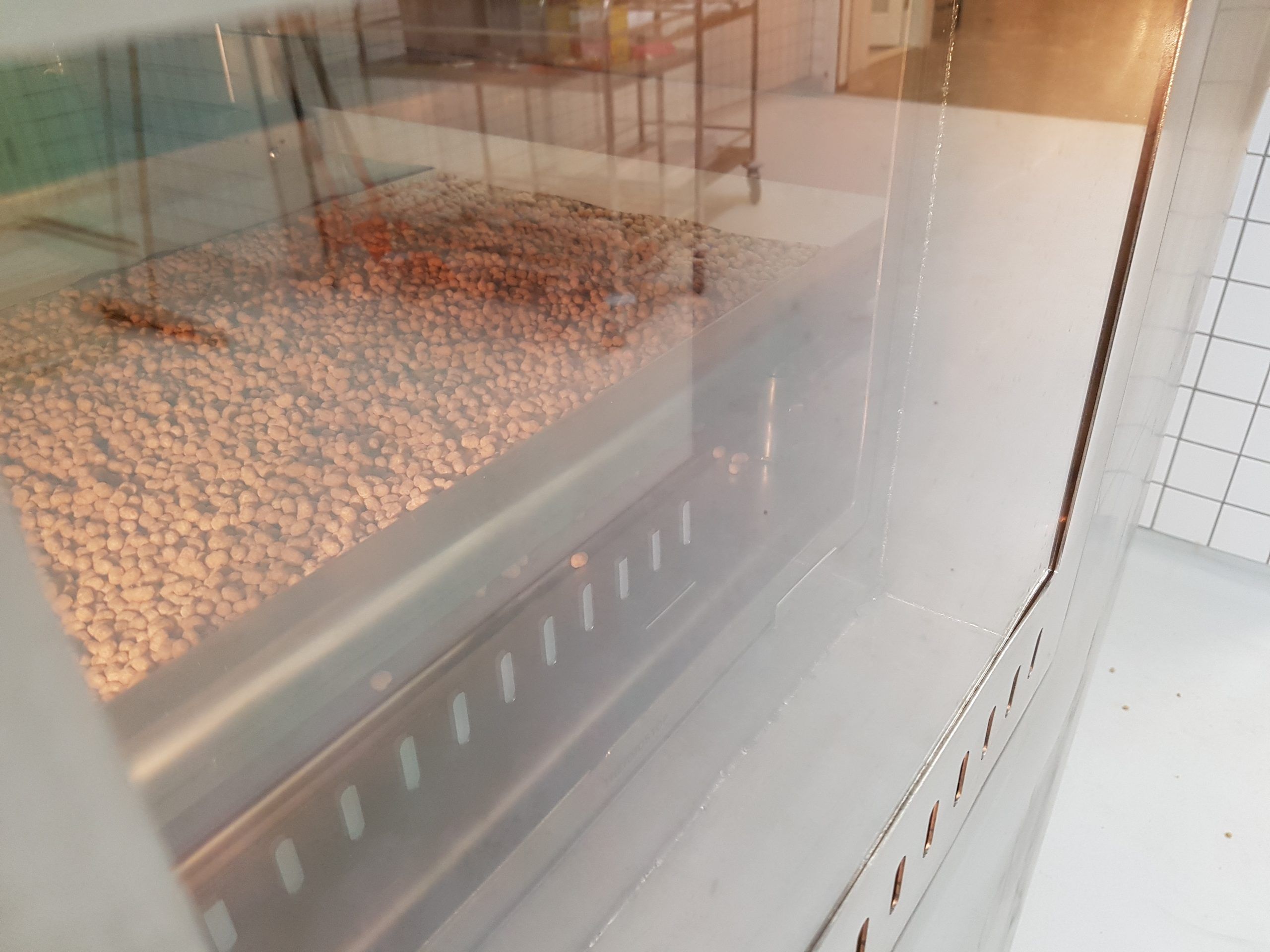 Tørretumbleren er designet til undervisningsformål på Erhvervsakademiet i Aarhus, og er også velegnet til produktudviklingstest i miniskala. Tørretumbleren kan både tørre med varmluft op til 200 grader og desuden med overophedet damp ved atmosfærisk tryk. Tørretumbleren har desuden en coatingfunktion, så du både kan tørre og efterfølgende coate testproduktet. Nedenfor er et billede af selve tørrekammeret. Produktet placeres i en produktholder, som er et D80 x 100 rør med en tragt, der forhindrer produkterne i at blive blæst ud af røret.